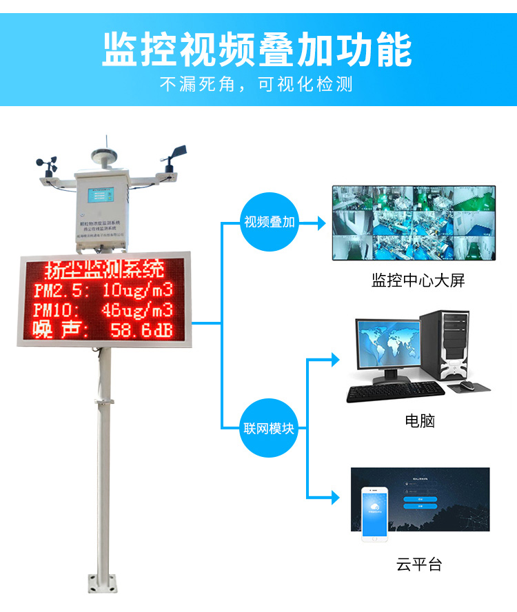 (7)揚(yáng)塵監(jiān)測(cè)設(shè)備支持政府聯(lián)網(wǎng)可對(duì)接環(huán)保局,揚(yáng)塵在線監(jiān)測(cè)系統(tǒng)還具有監(jiān)控視頻疊加功能,不漏死角,可視化監(jiān)測(cè)。