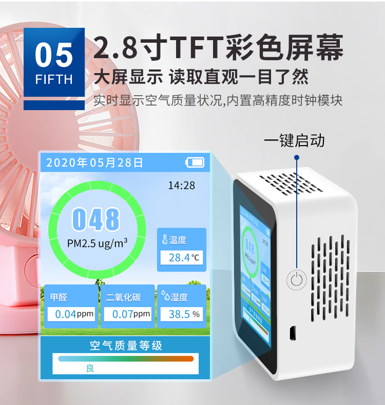 5、2.8寸TFT彩色屏幕,大屏顯示讀取直觀一目了然,空氣質(zhì)量檢測儀實時顯示空氣質(zhì)量狀況,內(nèi)置高精度時鐘模塊。