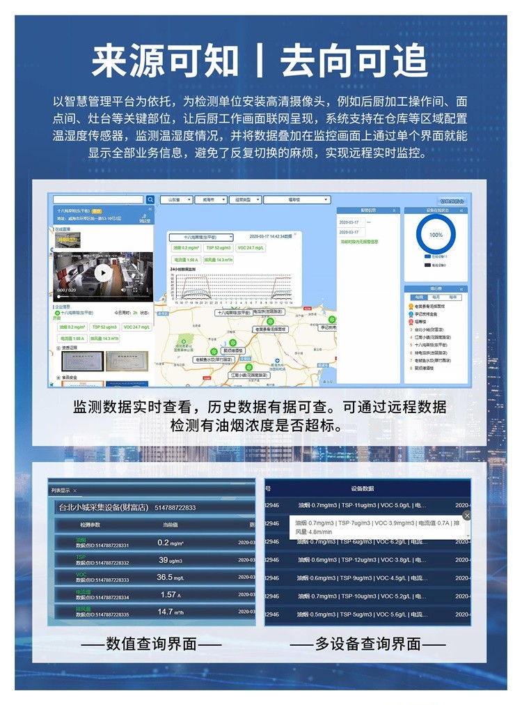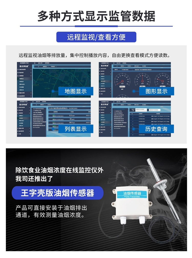 7、多種方式顯示監(jiān)管數(shù)據(jù):遠(yuǎn)程監(jiān)視油煙等排放量,集中控制播放內(nèi)容,自由更換查看模式方便讀數(shù)。