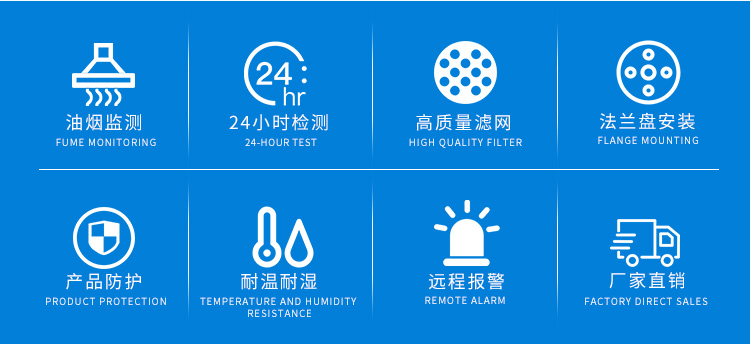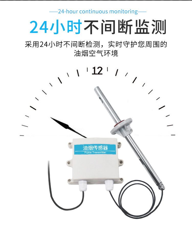 2、24小時不間斷監(jiān)測:油煙傳感器采用24小時不間斷檢測,實(shí)時守護(hù)您周圍的油煙空氣環(huán)境;