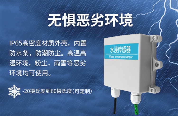 3、無懼惡劣環(huán)境,IP65高密度材質(zhì)外殼,水浸傳感器內(nèi)置防水條,防潮防塵。高溫高濕環(huán)境,粉塵,雨雪等惡劣環(huán)境均可使用,-20攝氏度到60攝氏度(可定制)。