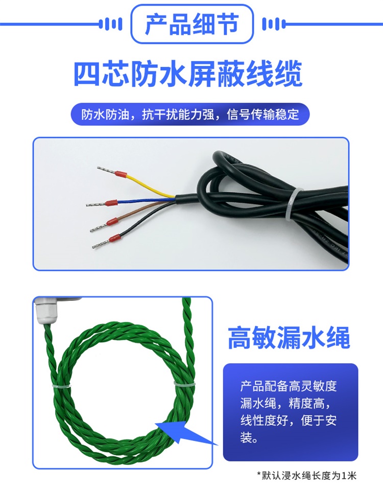 4、高靈敏觸水即報,漏水繩用于檢測傳導性液體滲漏,通過產(chǎn)品信號線的連接,一旦檢測到電線沿線的任何位置有液體為侵入,立即啟動報警功能,云平臺隨時查看數(shù)據(jù)。