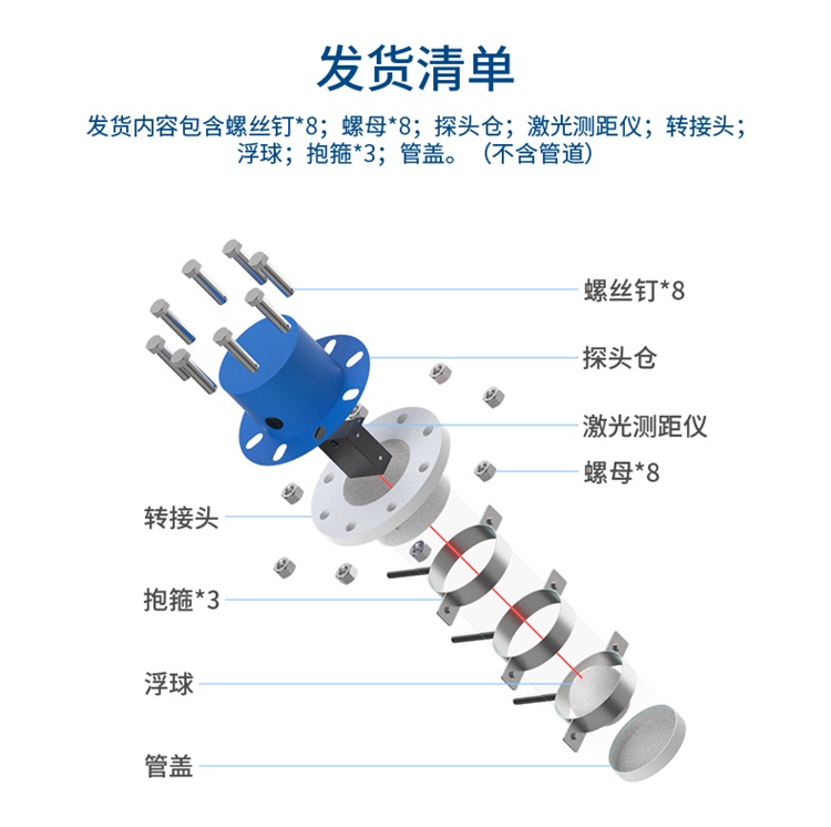2、激光浮球測距:可對水位進行標定,滿足10m內(nèi)的漲幅測量需求,穩(wěn)定性強,反應靈敏,底部配有管蓋,防止浮球脫離,且有效的排除水草魚蝦進入到管道的內(nèi)部,影響水位的測量;